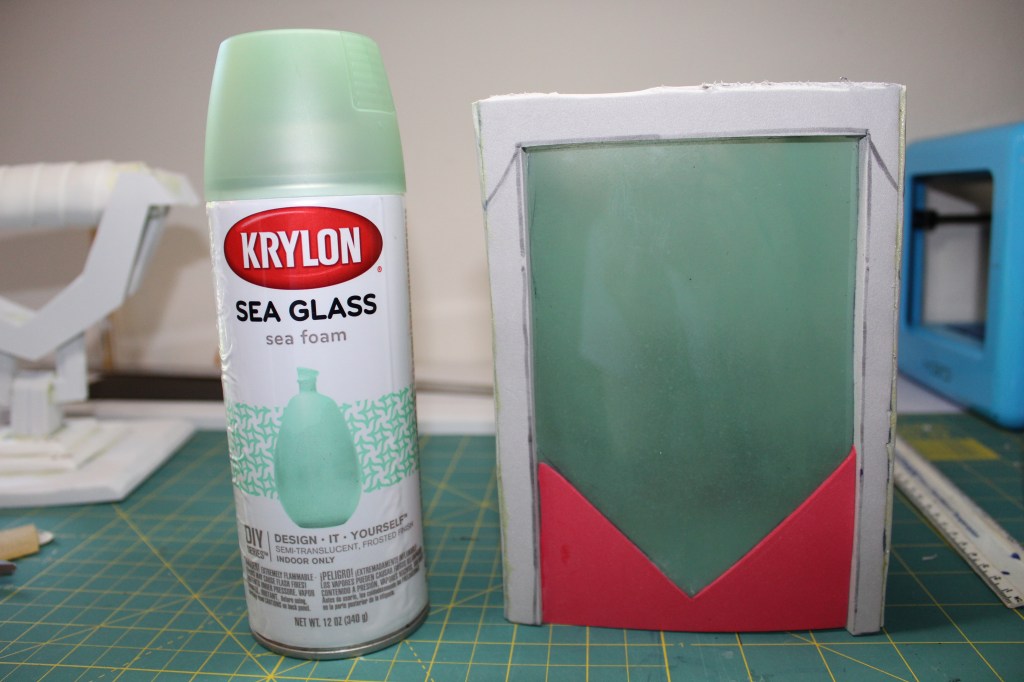 Take the film off one side of the plastic and ruff up the area where you want to place the foam with 220 grit sand paper. This will make it easier for the foam to stick to the plastic when we apply superglue. When you have the foam frames and decorations  attached remove the film form the other side of the plastic. I wanted the plastic to have a frosted look. I have some Sea Foam glass spray and applied 3 coats.