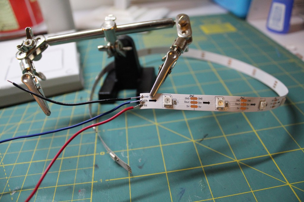 Make a cylinder out of 6mm foam. Make it long enough that it will stick to the bottom and the top of the lantern. Take you Neopixels and tin your wires and the pads on the neopixels strip solder you hook up wires to Ground, Power, and Data In. When working with Neopixles make sure the Arrow is pointing to the right. When that is done we will upload the code to our dev board.
