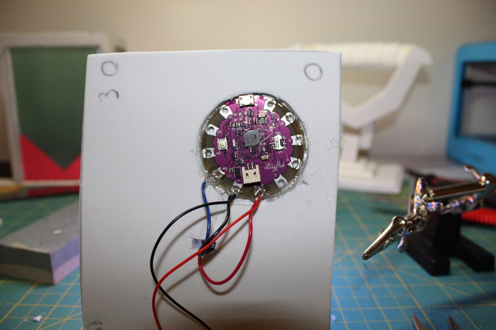 I watch the Punished Porps video on their build of the lantern. They linked to Schnoggo’s Github. https://github.com/schnoggo/jack-o-candle. It works great for this project. I had a Lilypad Arduino that work great for mobile or wearable projects. I coped the code form Schnoggo’s github and pasted it in Arduino Create. This is a browser based version of the Arduino IDE. Upload the code to you board and test to make sure the lights work on the board by connecting them with alligator clips. Once you have the lights working the way want detached the lights from the board and attach them to the cylinder. I used hot glue for this step.