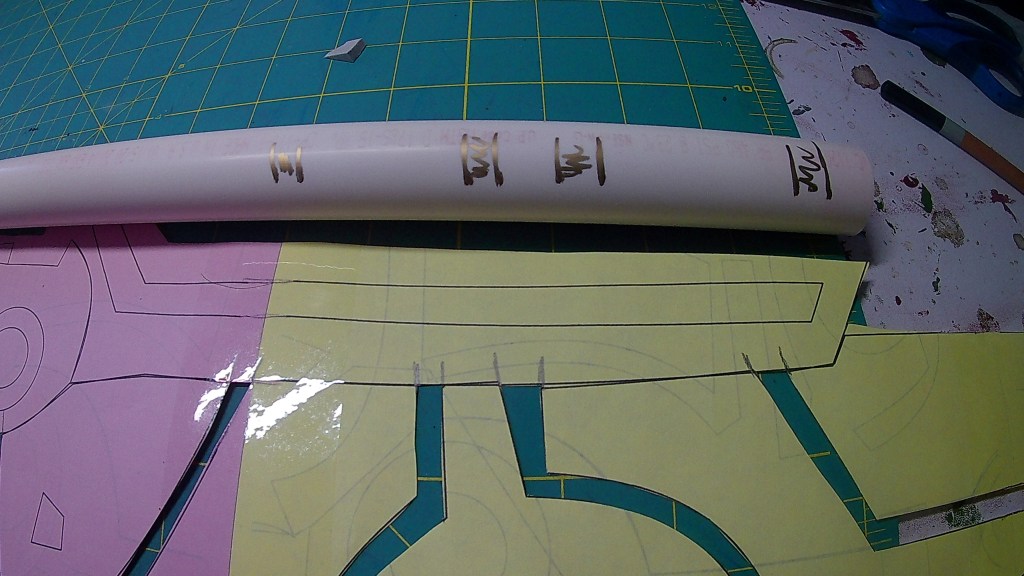 First put tape together your paper pattern. Take the spaces between your blade sections and transfer the markings to your PVC Pipe. I filled in the space where I wanted those parts to be empty. I then cut out the blades and transferred them to my Plastazote. I cut out 2 sides and then about 1/2 inch strips. I them made these into hollow boxes. I wanted these hollow so light could pass through easily.
