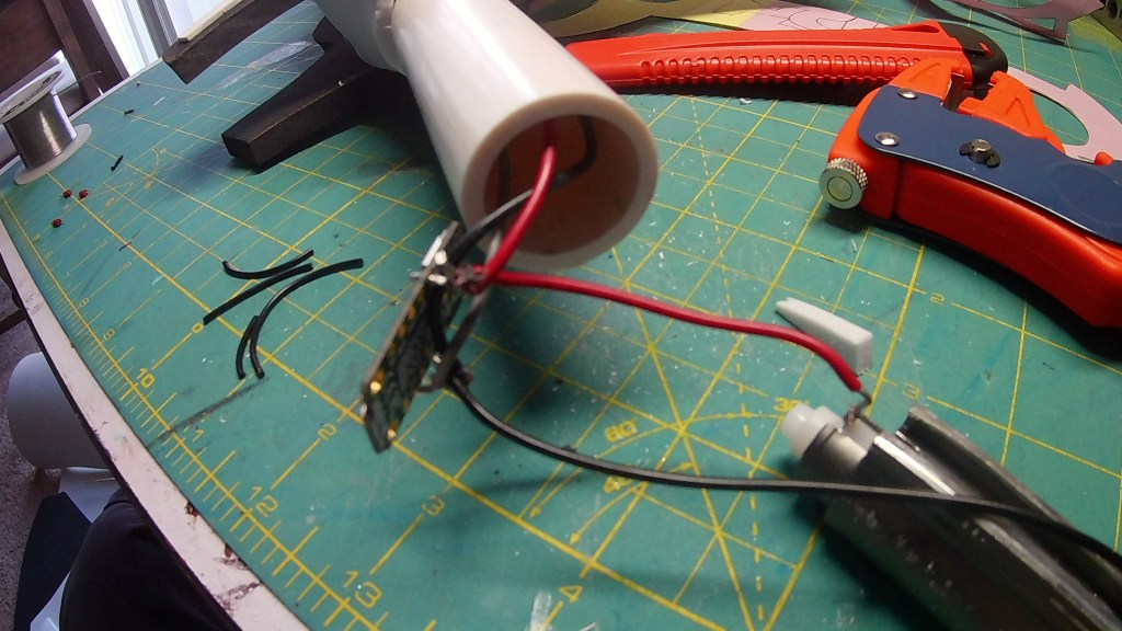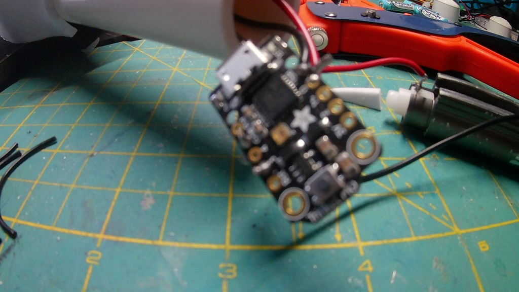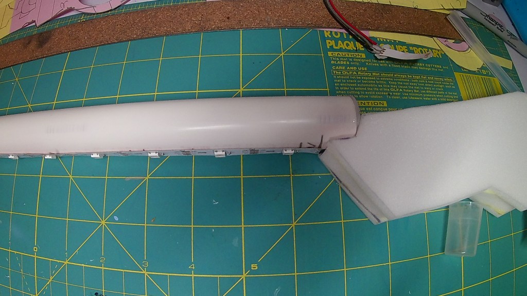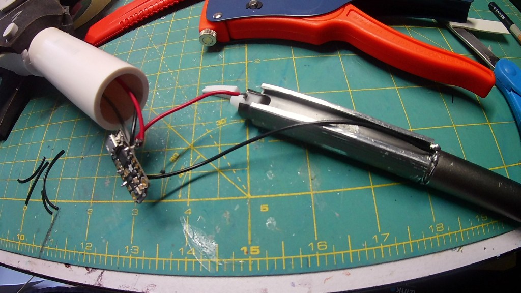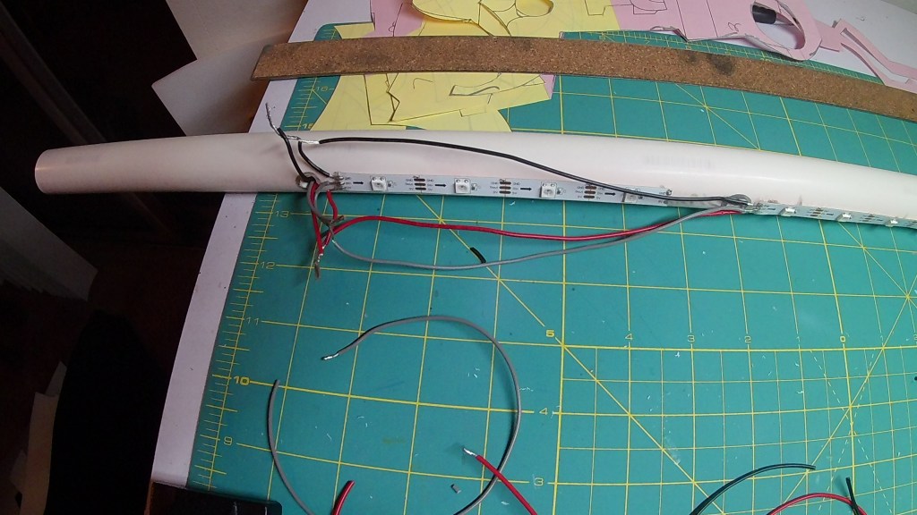 I used the same code form the Guardian Shield. I have the code upload to my GitHub account. This code is based on Adafruit’s Logan’s Run Hand Jewel LED tutorial. Measure and cut out your Neopixels strips.For Neoplxels you can cut between the Gnd, Dat, and the Pwd pads on each segment. Cut out your wire leads and solder them to your Neopixle strips. I had some strips left over from pervious projects. I had to make do with what I had. Once I got the lead wires on the LED Strips I used contact cement to glue them to the pipe. I did ruff the surface with sandpaper so they will stick better. I did drill a hole at the end of the last strip to attach all the wires together in parallel and to attach it the Trinket and the power source in the handle.