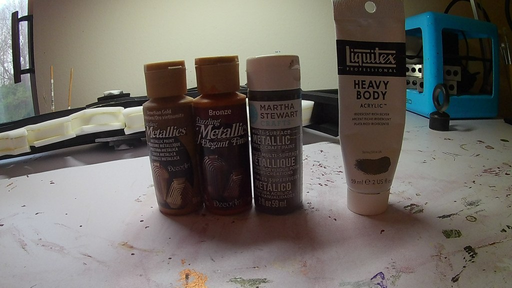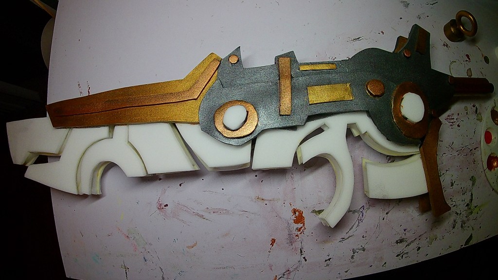 Once everything is glued together and the lights are working then it is time to heat seal the foam with the heat gun. You want the foam to look shiny and all the pores to close up. I first masked the Plastazote areas and used 2 thick coats of black plasti dip on the body. After that layer was dry I used clear plasti dip on the Plastazote areas. For the body base code I use a combo of Bronze, Gunmetal, Venetian Gold, and Rich Silver.