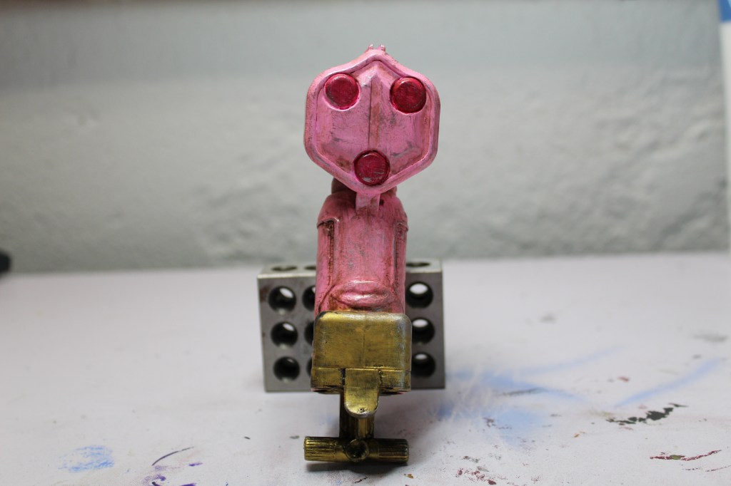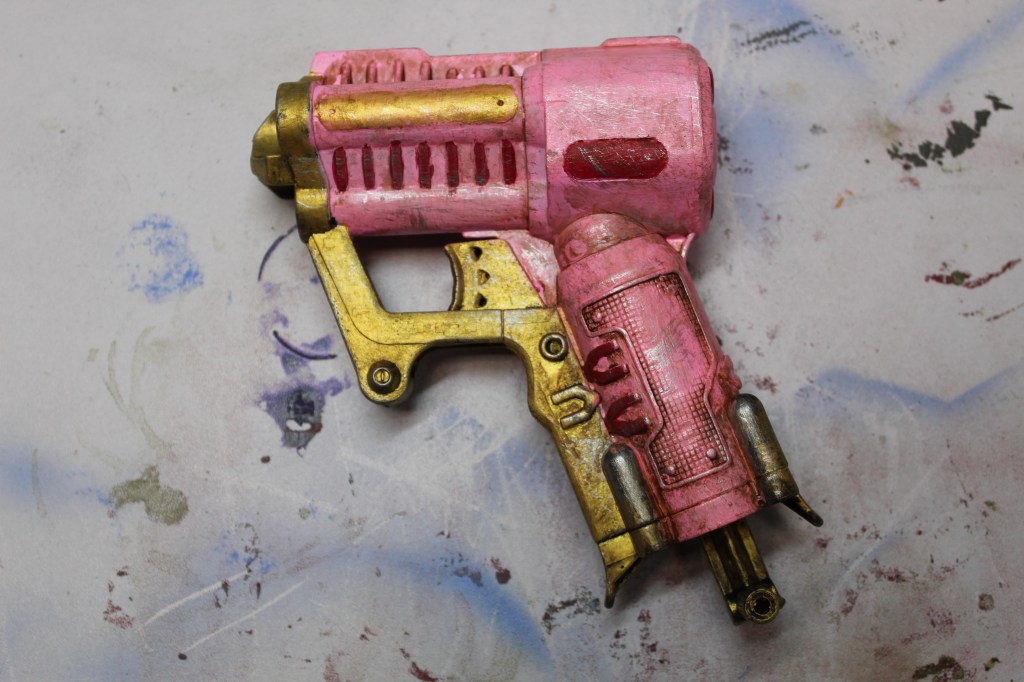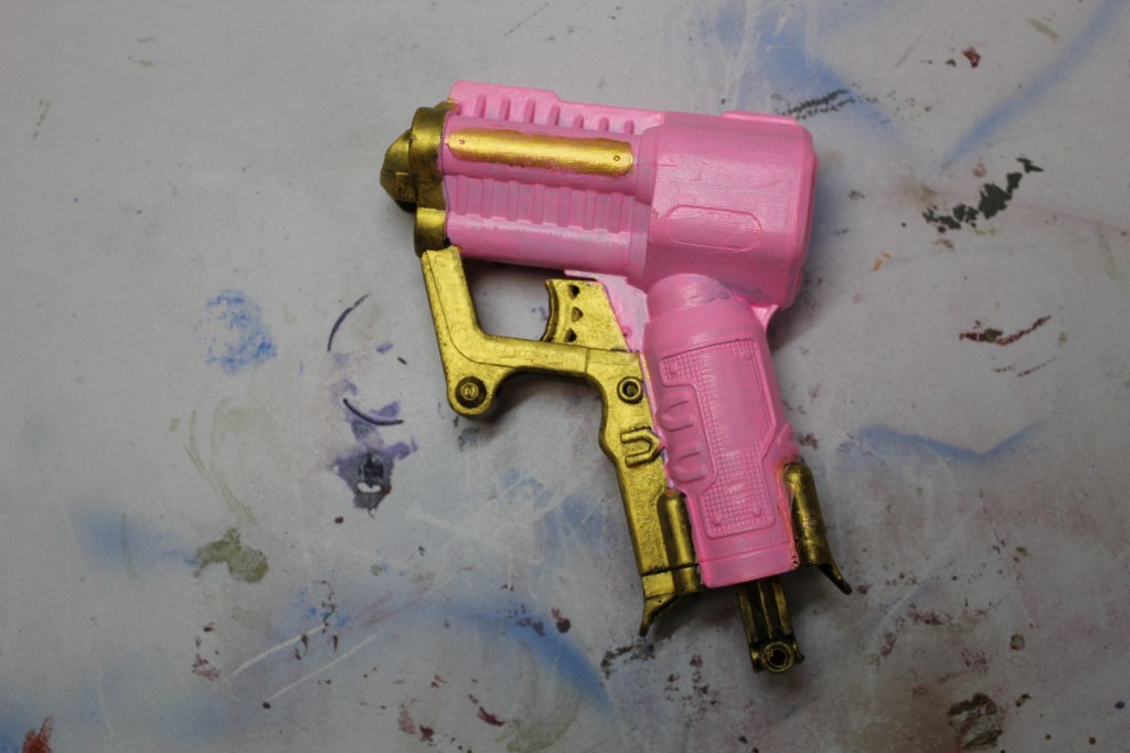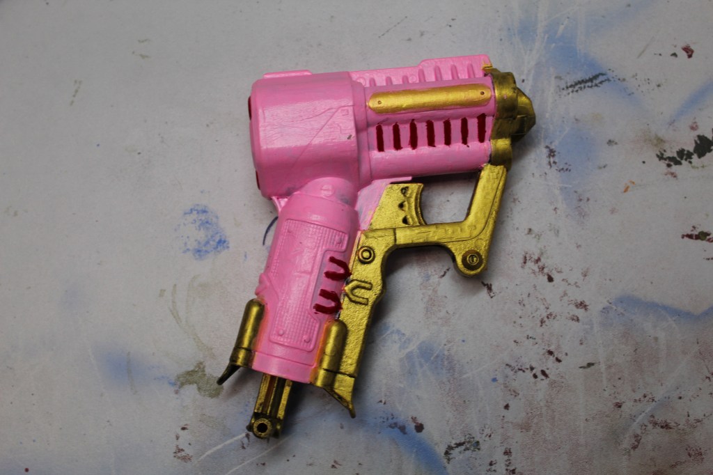 I coved the gun with a coat of Krylon Colormaxx Flat Black Pain + Primer. I used the wand from Elvenstore Etsy’s shop and a reference for the color schema. I wanted most of the gun to be pink and it took a bout 5 heave coats of the pink and white paint to get it to cover nicely. I wanted the outside edges to be the gold color and this took about 3 coats to get it to cover. The last was adding red paint for accent colors.